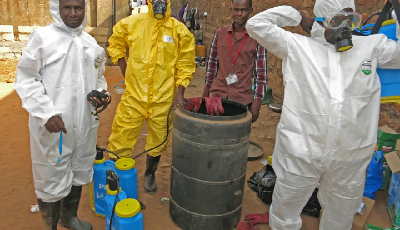 Sikasso prison, Mali. Technical staff get the equipment and disinfectant ready.