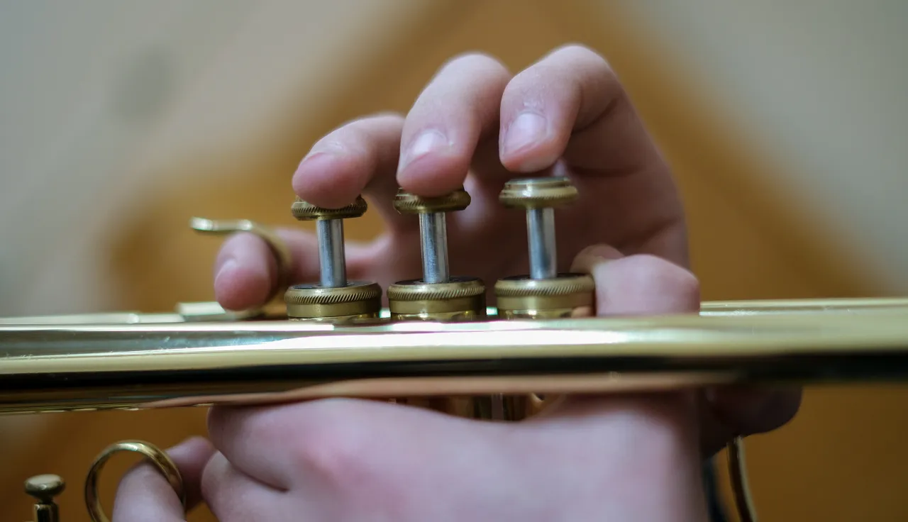 A group of teenage musicians get ready to play their instruments. One of them is playing the trumpet, accompanied by a drummer and choir. With his eyes closed and fingers moving deftly over the trumpet keys, the youngster is deeply immersed in the music.