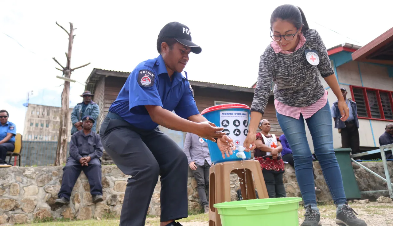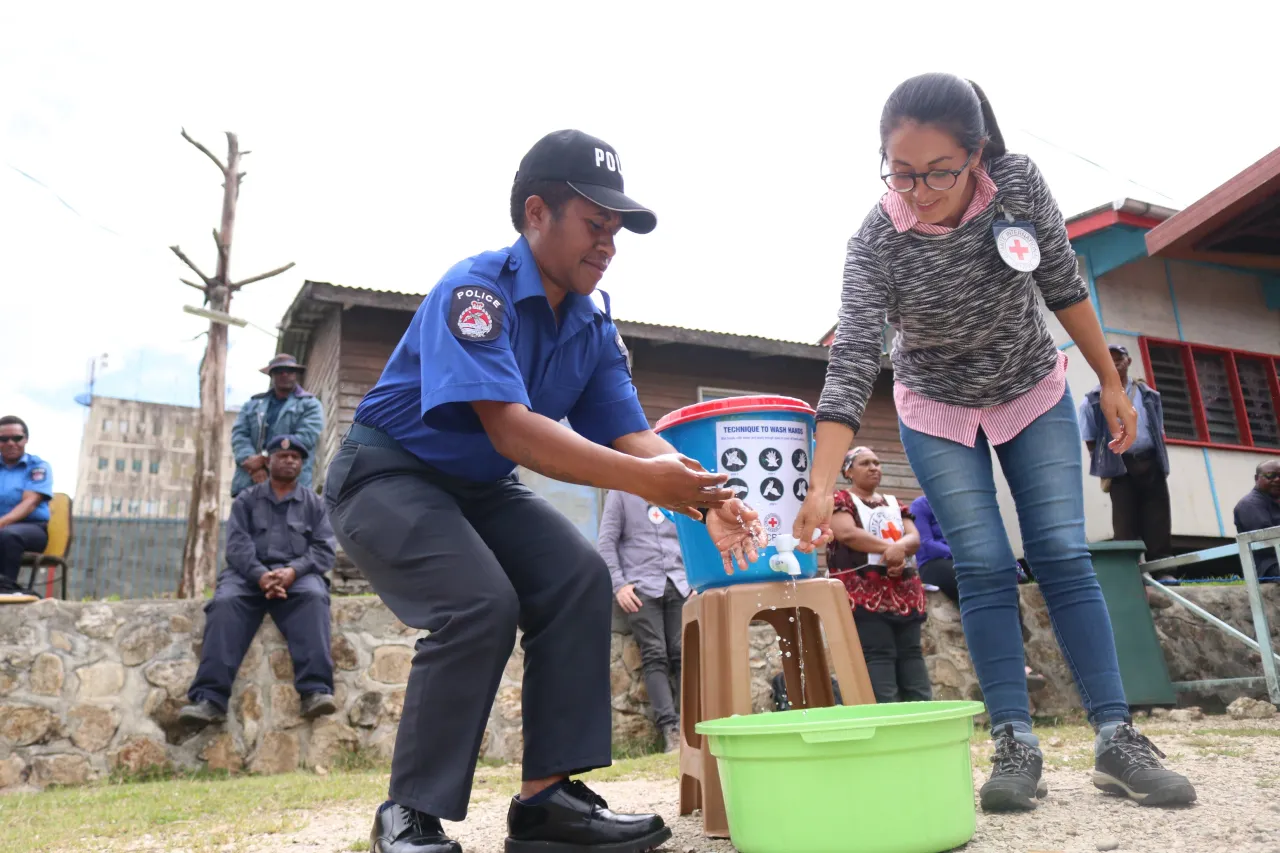 A PNG constable demonstrating handwashing techniques alongside an ICRC delegate during COVID-19 awareness-raising session with police in Mendi.