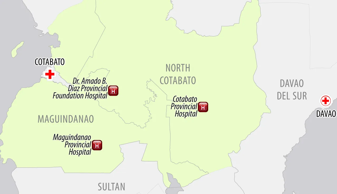 The ICRC regularly supports three hospitals in the provinces of North Cotabato and Maguindanao, providing medical equipment, supplies and medicines needed to stabilize and treat the weapon-wounded. These are the Cotabato Provincial Hospital (Amas/Kidapawan) and Dr Amado Diaz Provincial Hospital (Midsayap), both in North Cotabato, and the Maguindanao Provincial Hospital, located in Shariff Aguak. In 2014, at least 76 weapon-wounded patients benefited from ICRC's support to these three hospitals.