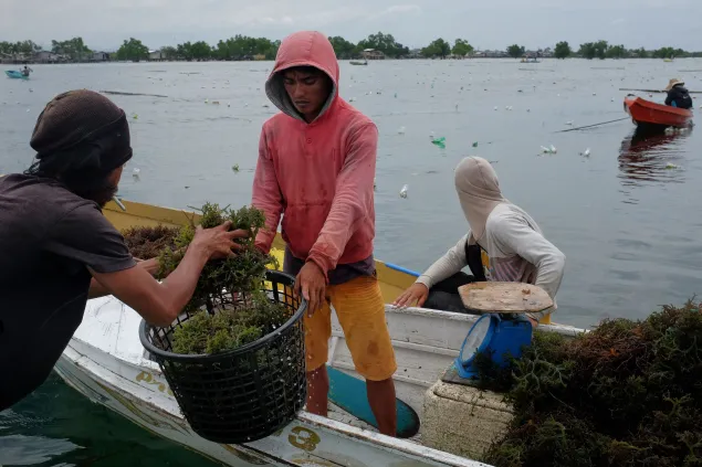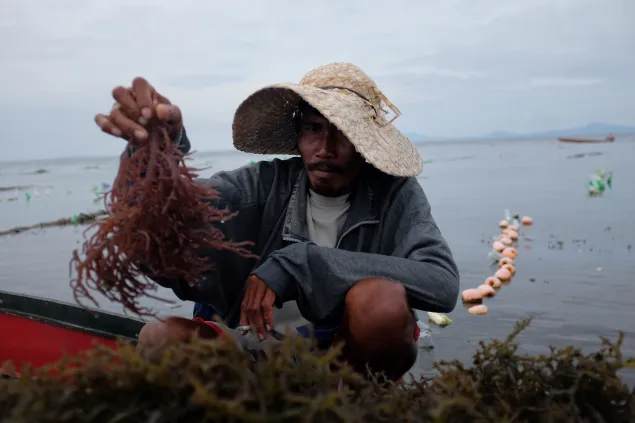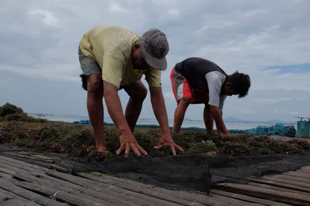 Unlike with other crops, seaweed farming can be done all-year round. It takes a month after planting for the seedlings to mature. In this photo, a farmer removes moss from the binder where the seedlings will be tied.