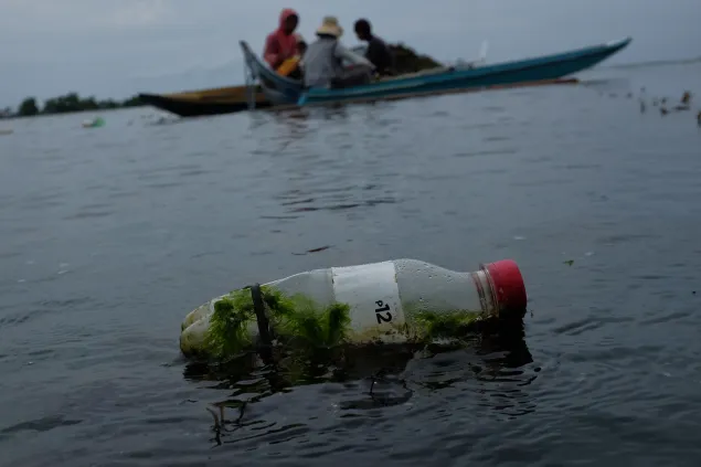 Recycled plastic bottles are used as floaters where lines of seaweeds are tied. Farmers buy these in bulk from junk shops in the city.