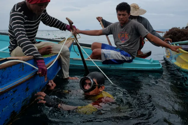 A group of young seaweed farmers makes use of a compressor that supplies air while they dive and gather loose seaweeds or those that have fallen off from the lines. One of them is 25 years old Arman Sali who started using the compressor when he was only 13 years old. "One compressor usually lasts for more than two hours underwater," he explains.