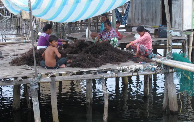 In the small village of Layag-Layag, seaweed farming is a family affair. Planting and harvesting are tasks usually reserved for the men, while the women and children stay at home preparing the seedlings for planting by tying them in bundles.
