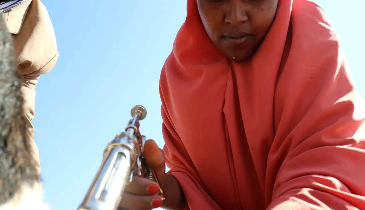 In a crowded pen made of thorny shrub brushes and twigs, a herder pulls away a sheep and holds it long enough for Saamiya Mohamed to inject it with a dose of vitamins and anti-parasitic medicine. The small animal cries out and runs away. But it's now protected.