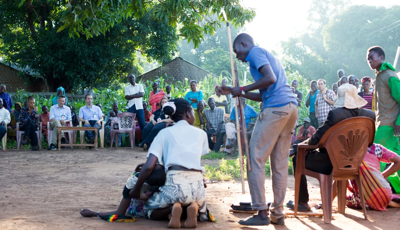 Volunteer actors from South Sudan Red Cross perform a weekly theatre drama where they raise awareness of the importance of protecting health-care workers and facilities.