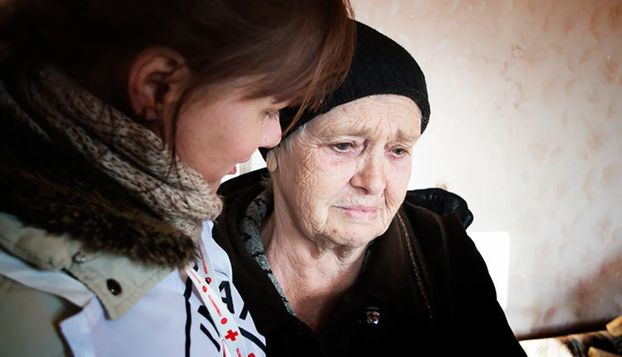 The volunteers offer health care, tell travelers what documents are required to cross to the non-government controlled territory, and often explain that the visitors can get assistance from the ICRC.