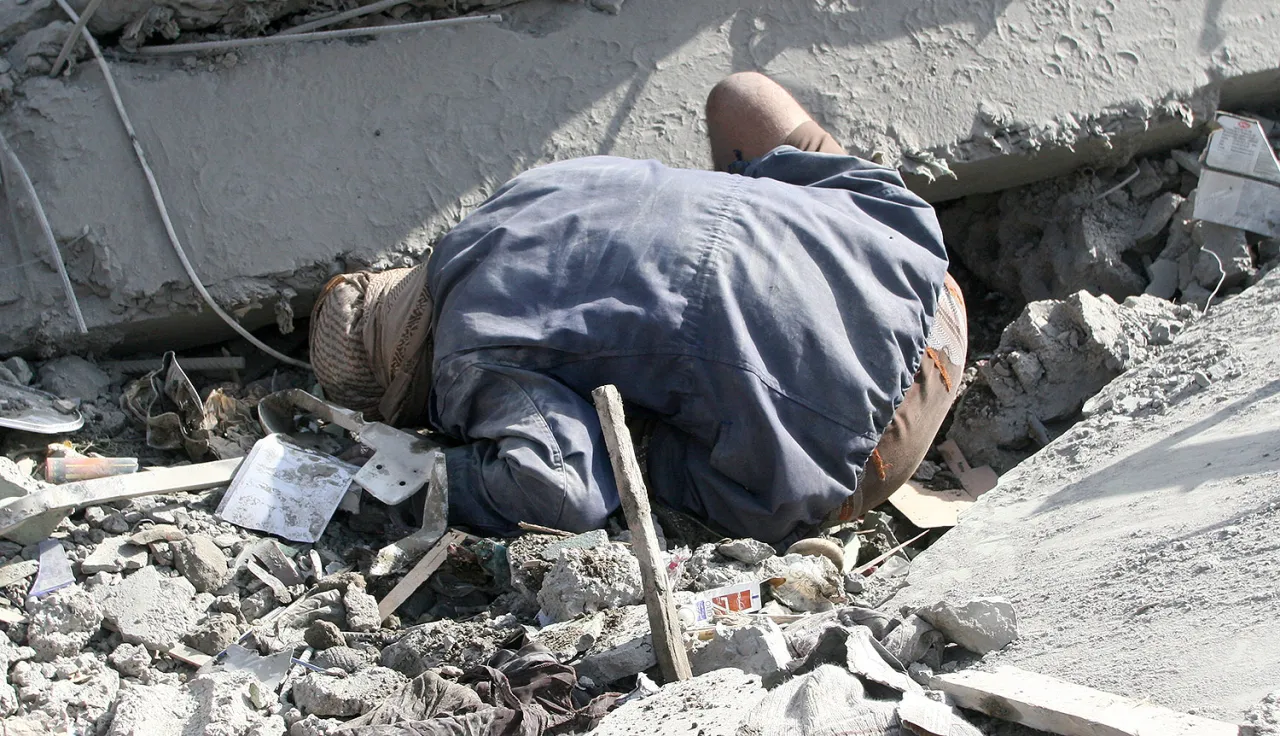 Salah neighbourhood, Taiz city. A father pulls out his son's bicycle from a rubble pile where their house stood a day before. /CC BY-NC-ND/ICRC/ A. Mahyoub