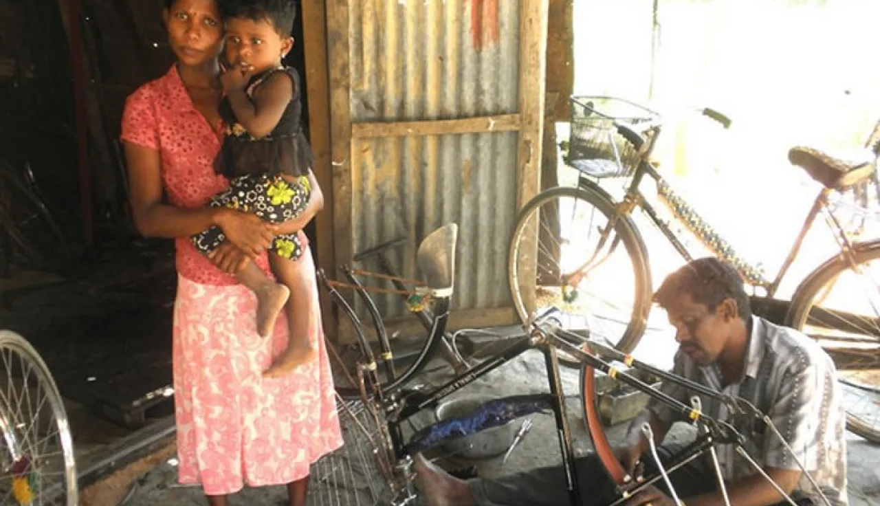 Puvaneswaran Kavita (de 24 años de edad) es viuda. Se reasentó en Valluvarpuram, Kilinochchi junto con su hija y sus padres tras el fin el conflicto, pero no tenía un ingreso estable. Se inscribió en el programa de emprendimientos microeconómicos y, con el subsidio que recibió, abrió un taller de reparación de bicicletas.