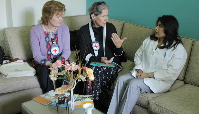 Christine Beerli, vicepresidenta del CICR, y Silvana Mutti, jefa de la delegación del CICR para Bolivia, Ecuador y Perú, dialogan con los representantes de las personas privadas de libertad en la zona llamada “la muralla”, al interior del penal de San Pedro.