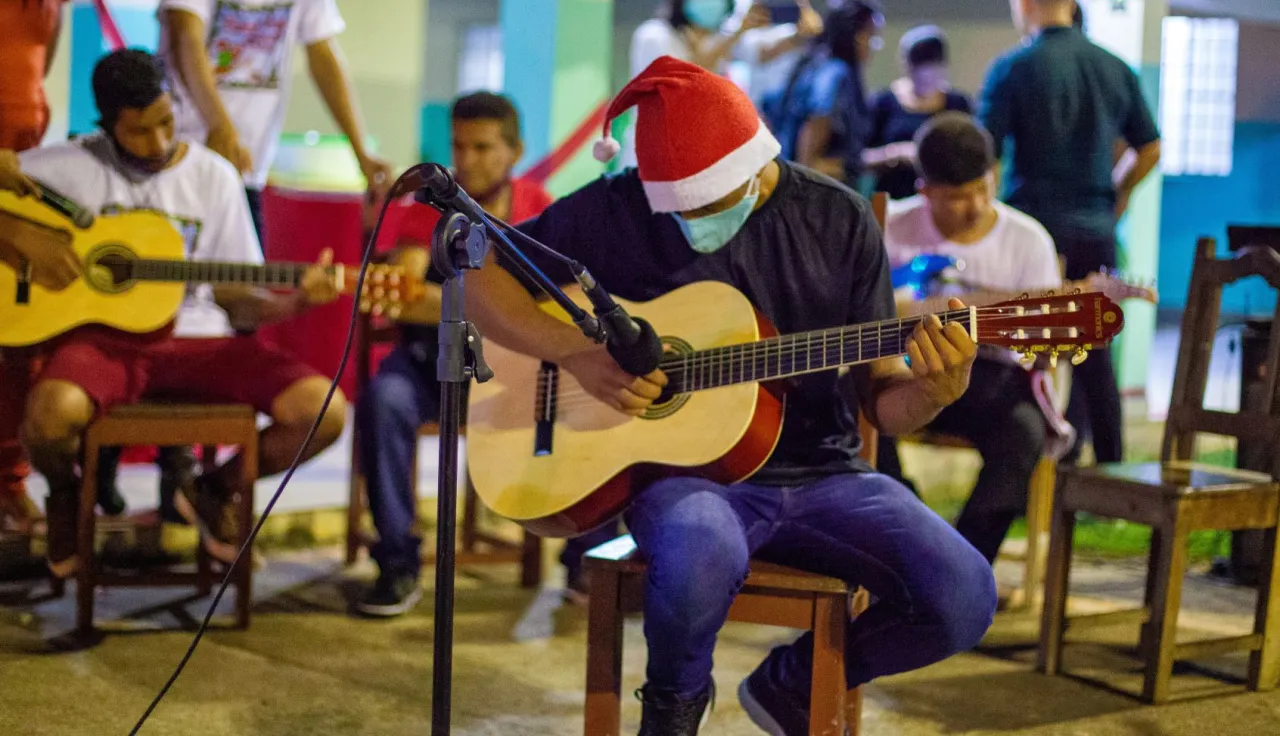 Sentado con una guitarra en el regazo, Luiz*, de 13 años, deslizó sus dedos por las cuerdas, y el sonido invadió el patio. Frente a él, más de treinta personas se detuvieron para verlo tocar. Era la noche del 23 de diciembre, y la presentación celebraba la Navidad.