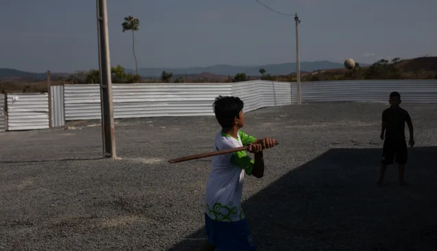 Niños migrantes juegan béisbol en el refugio de Pacaraima, Brasil.