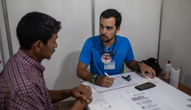 Un empleado del CICR orienta a un migrante en el puesto de atención del CICR en Boa Vista, Brasil.