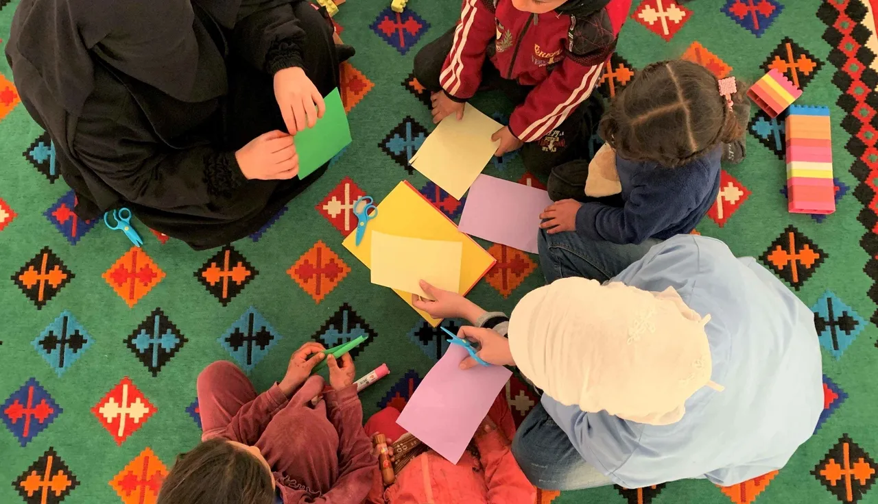 Alessandra y algunos niños en la tienda de apoyo psicosocial antes del inicio de la actividad.