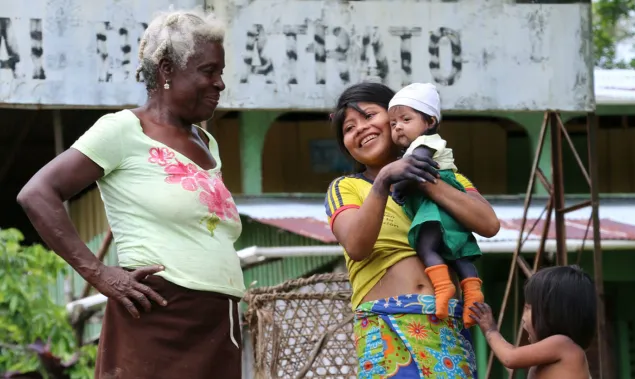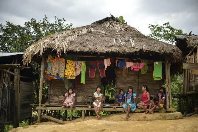 Mujeres de la etnia wounnan, en Chocó, se reunen para cuidar a los más pequeños y hacer artesanías. Algunas de estas comunidades están rodeadas por minas antipersonal y otros artefactos explosivos.