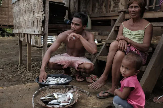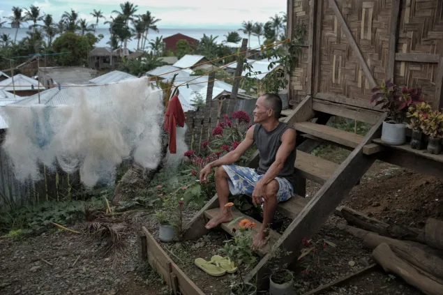 Mientras pone sus redes a secar, el pescador Jovencio Gaditano se toma un descanso en su pequeño jardín con vista a la bahía de San Pablo, donde todos los días trata de ganarse la vida en las primeras horas de la mañana.