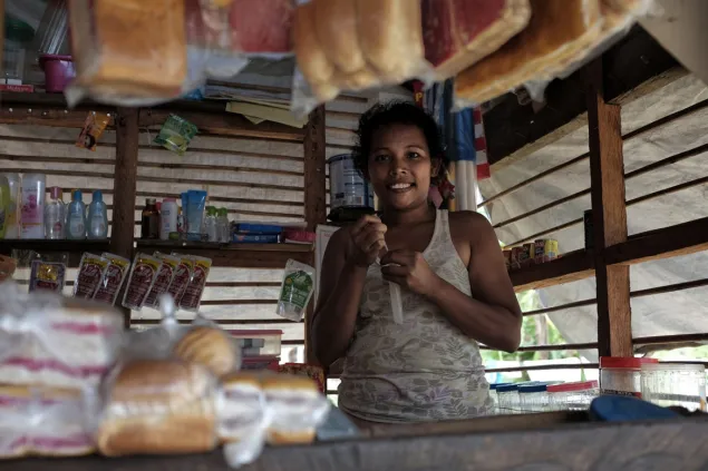 Para Prescila Padrilan, tener un “sari-sari” (una tienda de artículos variados) ayuda a incrementar los ingresos familiares. Recibieron del CICR un refugio básico, que han instalado frente a su pequeña empresa.