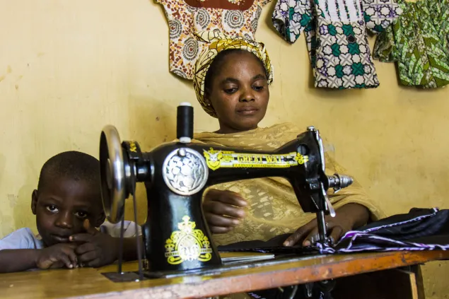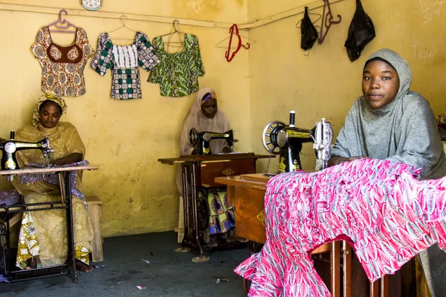 Con la subvención del CICR, Amina compró tres máquinas de coser y ahora tiene su propio centro de sastrería. Ahora enseña la profesión a dos aprendices para que se conviertan en modistas cualificadas.