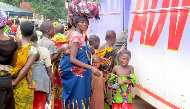 Las mujeres y los niños ascienden a uno de varios autobuses contratados por el ACNUR para llevarlos de Kigoma al estadio del lago Tanganyika.