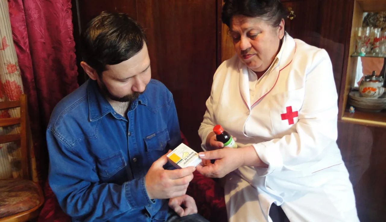Valentina Ivanova es una enfermera domiciliaria que trabaja en la filial regional de Holosievo de la Cruz Roja de Ucrania en Kiev. Valentina conoce bien este distrito. Va casi a diario. Con su uniforme blanco adornado con una pequeña cruz roja y su pelo rubio cuidadosamente peinado, es una figura familiar mientras hace su ronda de visitas. Por pasillos oscuros, detrás de puertas gruesas, hay personas que la esperan. Con formación en atención psicosocial además de ser paramédica, Valentina está bien preparada para hacer su trabajo. También tiene un corazón amable. Para las personas a las que atiende, enfermas y solas, abandonadas y afligidas, es más que un simple vínculo con el mundo exterior. Es una amiga. En algunos casos, la única que tienen.
