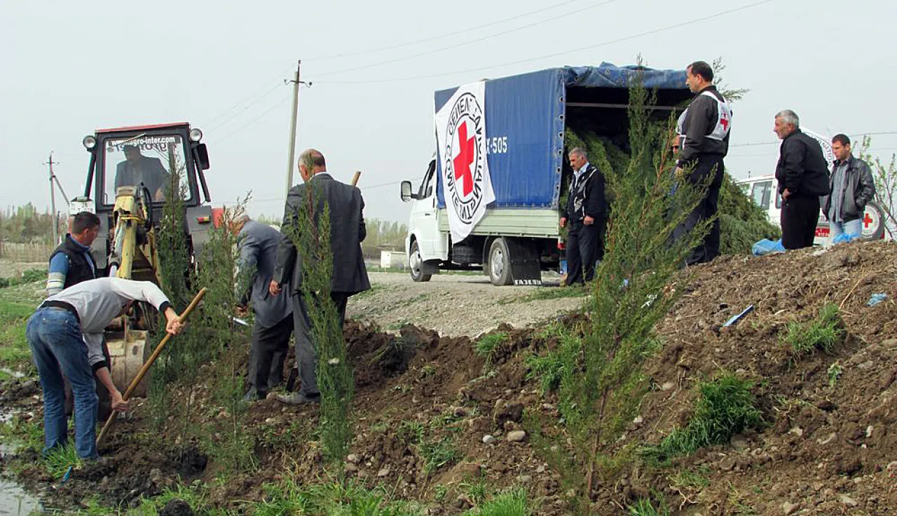 District de Terter, Azerbaïdjan. L'équipe chargée de planter les arbres, avec l'emblème protecteur du CICR bien en évidence. CC BY-NC-ND / ICRC / N. Lambert
