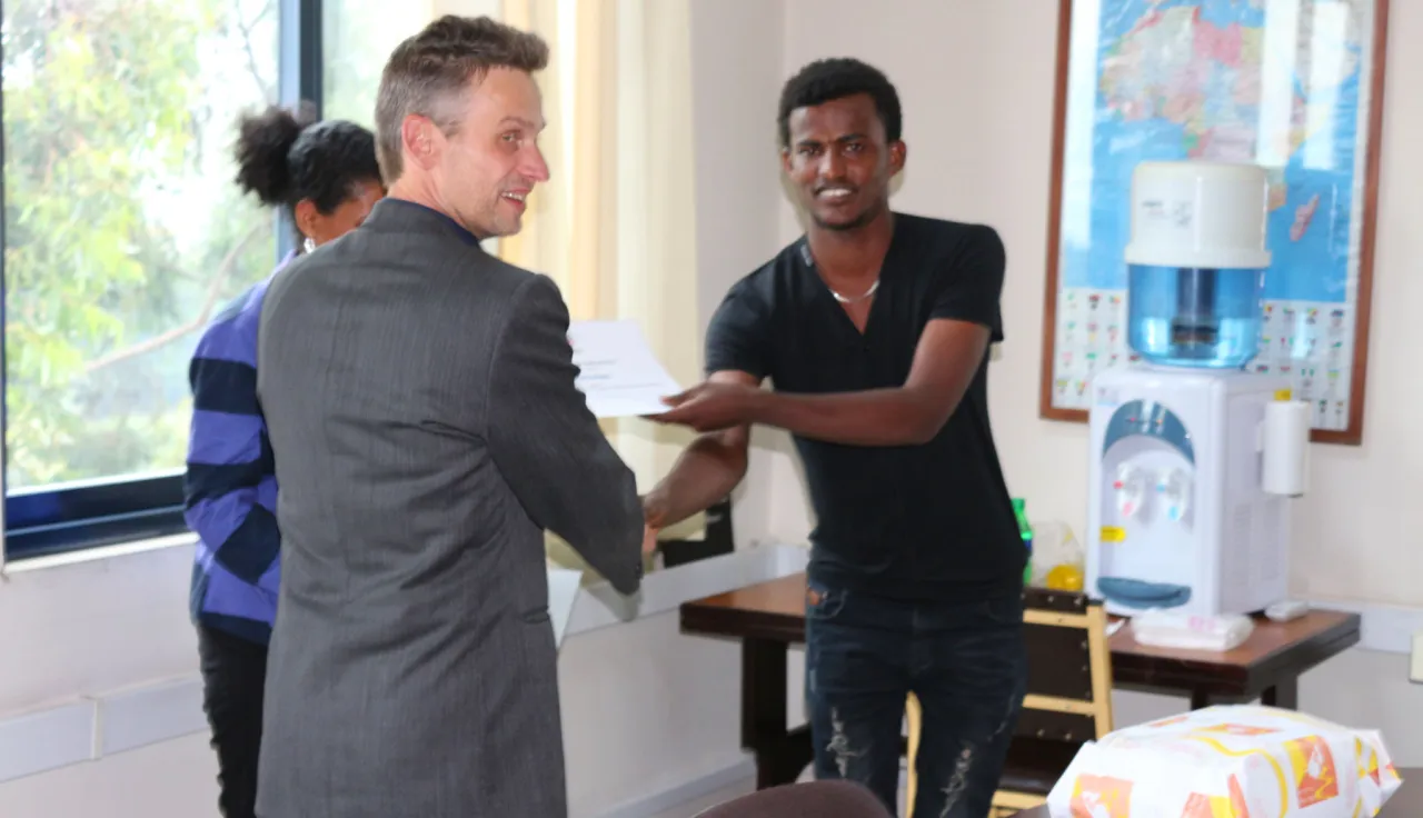 Le prix a été remis à M. Ashagre par le chef de la délégation du CICR, James Reynolds, lors d'une cérémonie organisée à la délégation d'Addis-Abeba.