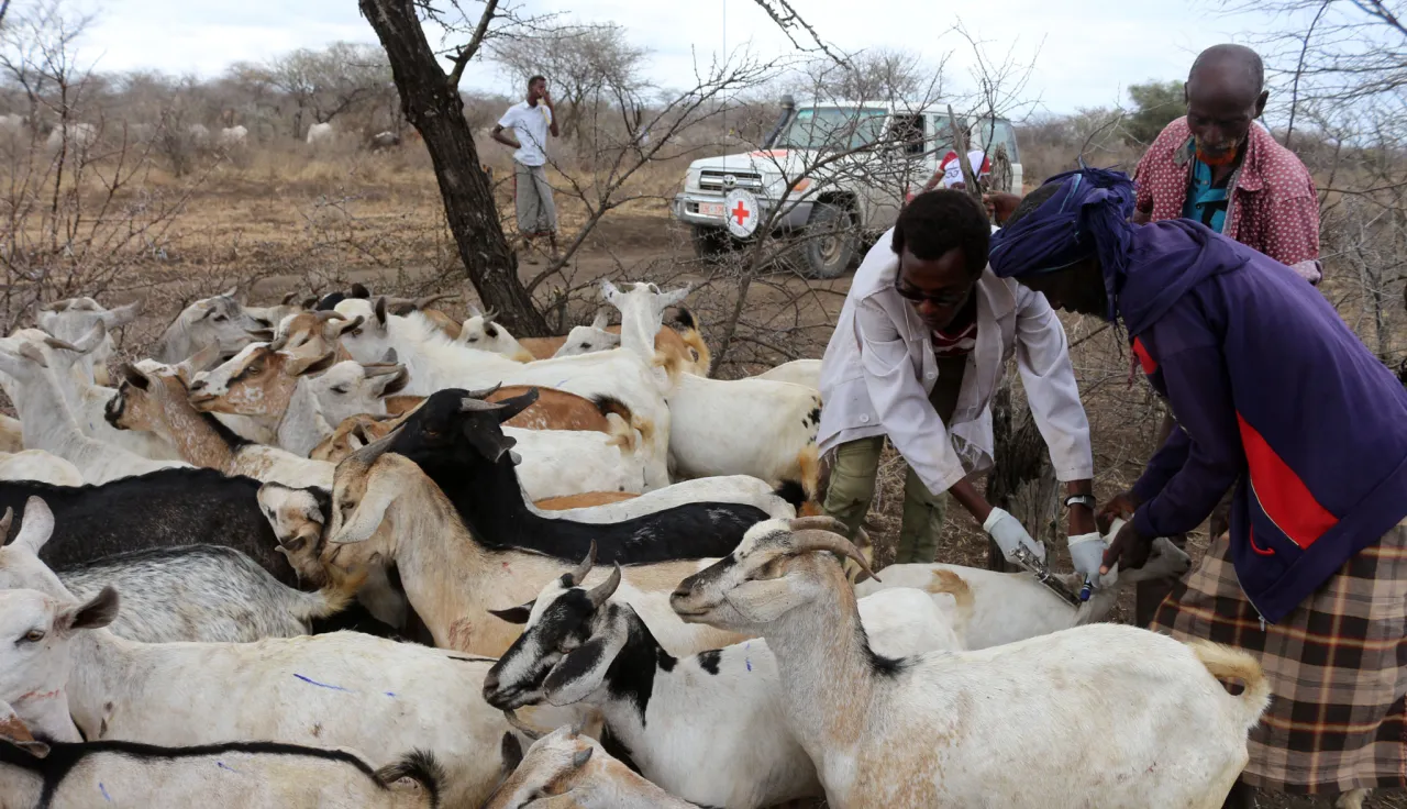 Un collaborateur du CICR aide les éleveurs locaux à faire vacciner leurs bêtes. CC BY-NC-ND / ICRC / Alemayehu Takele