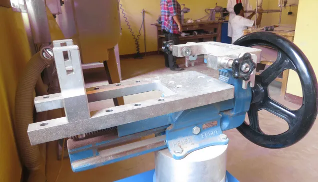 Selon l’approche multidisciplinaire préconisée par le FSH, Élisabeth est prise en charge en même temps par les kinésithérapeutes et par les techniciens. Ils repèrent ensemble les points à rectifier afin de réaliser un nouveau moulage et d’effectuer d’autres ajustements. Le fait qu’un patient réussisse à bien marcher dépend avant tout de la qualité de l‘appareillage et des exercices de mise en charge et d’équilibre.