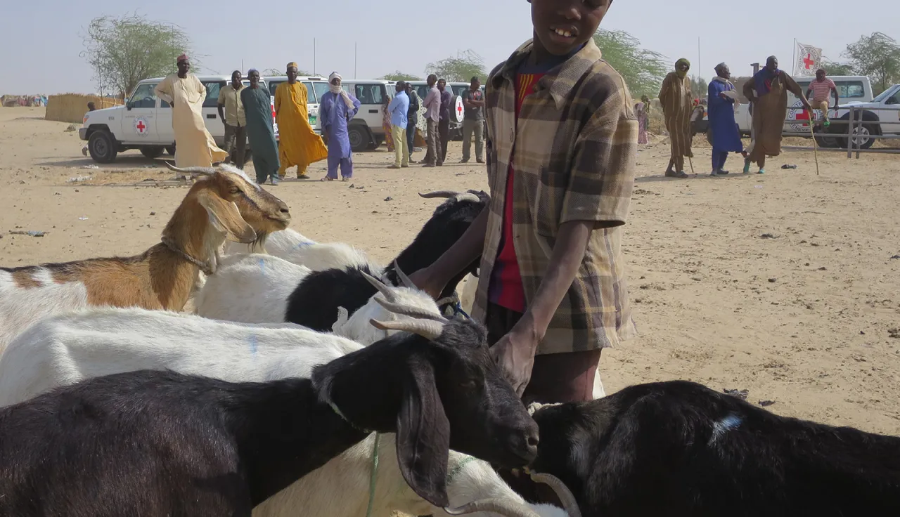 Localité de Kintcha Indi, à 65 km à l'est de Diffa. Le jeune Bello se tient seul à côté de plusieurs adultes, entouré de ses chèvres. La scène est inhabituelle. Il est là pour que ses bêtes bénéficient des services de vaccination et de déparasitage que le CICR rend régulièrement dans la région.