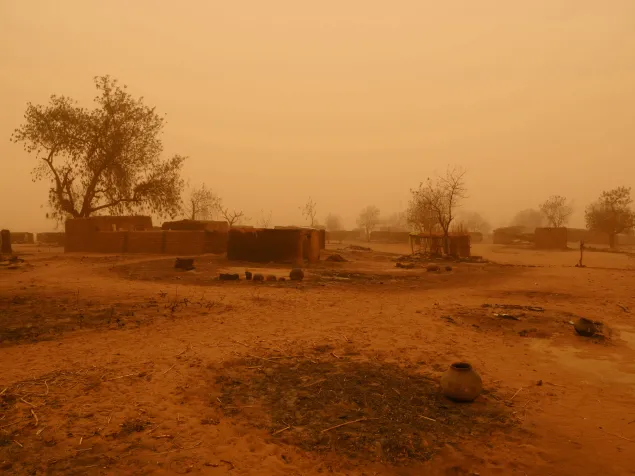 Une poussière rougeâtre soufflée par le vent recouvre tout : cases et greniers incendiés, bâtisses criblées d'impacts de balles, voitures calcinées, cadavres d'ânes. Les puits pollués avec des carcasses d'animaux sont inutilisables. Les troupeaux ont été emportés.