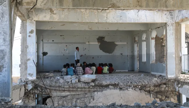 L’Organisation des Nations unies estime à 2 millions le nombre d’enfants déscolarisés dans le pays et à plus de 2 000 le nombre d’écoles endommagées ou détruites par la guerre. Lorsqu’une école est détruite, ce n’est pas seulement le bâtiment dans lequel les enfants sont censés recevoir une éducation qui est anéanti, mais également le lieu dans lequel se construisent des amitiés de toute une vie.