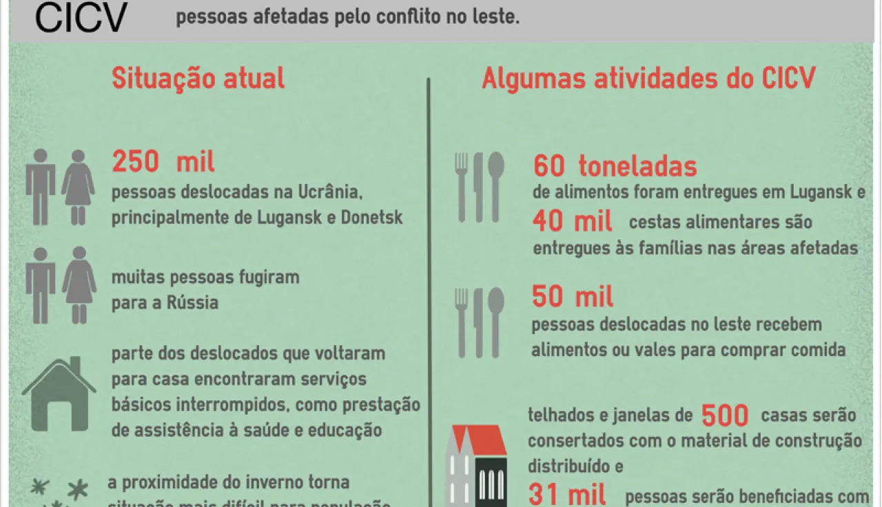 O CICV tem uma delegação em Kiev, na qual trabalham 25 colaboradores, ademais de escritórios em Donetsk, Kharkiv e Odessa. Estamos aumentando a nossa presença nessas cidades em resposta às necessidades da população que sofre os efeitos da situação no leste da Ucrânia. O CICV também tem subescritórios em Starobilsk e Mariupol.