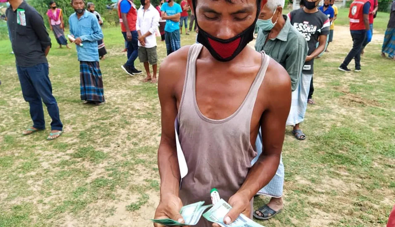 Um beneficiário afetado pela pandemia de COVID-19 recebe ajuda financeira em Khagrachari.