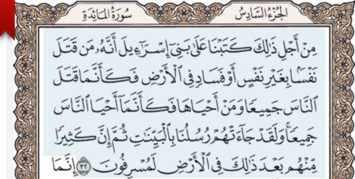 Отрывок из Корана, Сура 5 «Трапеза», аят 32. (Источник: KSU Electronic Moshaf project)