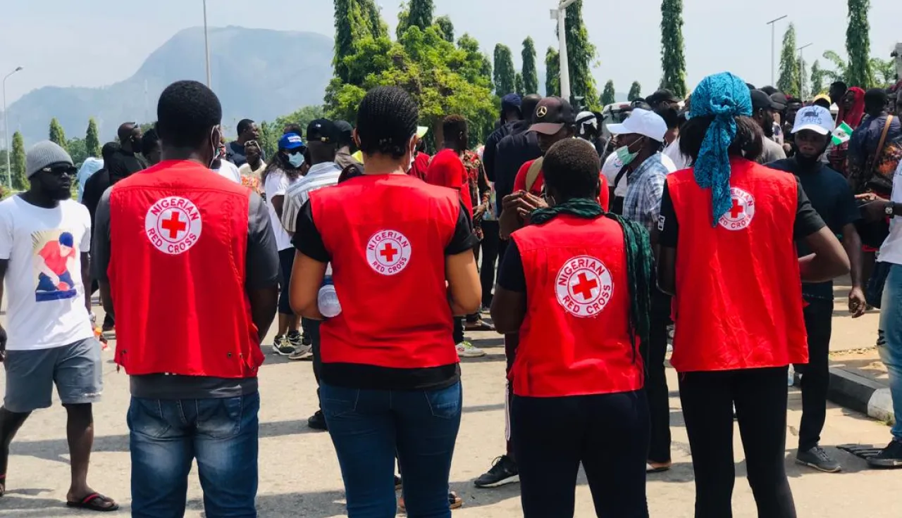 Добровольцы Нигерийского общества Красного Креста (НОКК) находятся на месте событий, чтобы оказывать первую помощь и эвакуировать раненых.