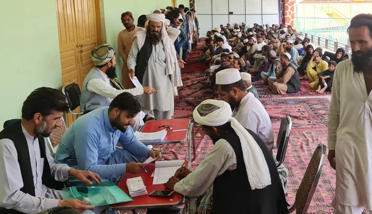 来自瓦沙哈拉的民众聚集在阿富汗霍斯特省东部的一个体育场,等待领取可灵活使用的现金援助。