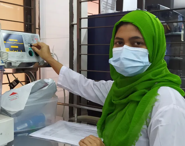 比帕莎·阿克特尔(Bipasha Akter)在科克斯巴扎尔的萨达尔医院担任急诊护士已经5个月了。她表示:“我们作为急诊护士,发挥了非常重要的作用,因为我们会积极参与到患者的救治中。按照分诊制度的规定,我们根据患者的健康状况进行分类,确保优先照顾需要紧急救治的患者,并在初步体检之后将其交由医生诊治。科克斯巴扎尔第一批新冠肺炎患者抵院之后,我很害怕为他们提供治疗。但红十字国际委员会为我们提供了个人防护用品,我就再也不怕了。我住的地方离家很远,房东想知道我和室友是否在救治新冠肺炎患者,不过我们没有告诉他,室友已经检测阳性了。另外,因为害怕传染给家人,我曾经4个月没有回家,在确定PCR检测阴性之后才敢探亲。”