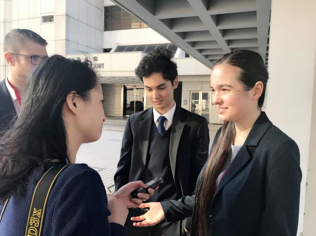 决赛结束后,澳大利亚新南威尔士大学代表队的选手接受了新华社驻香港站记者的采访。克里斯托弗·基亚姆(右二)告诉记者,这次竞赛使他有机会接触此前没有学过的国际人道法,在备赛过程中开拓了眼界,看到更多自己可能感兴趣的法律领域,对其中一些领域他有意继续研究并撰写论文。他也是本次竞赛最佳辩手的获得者。