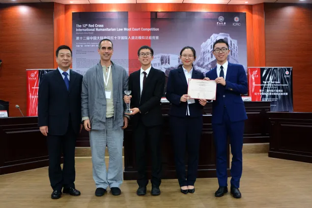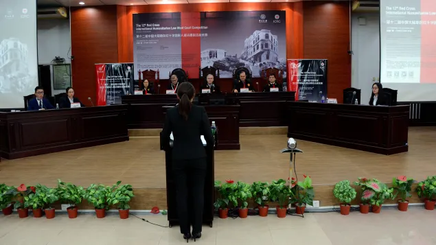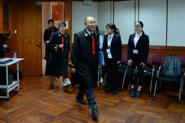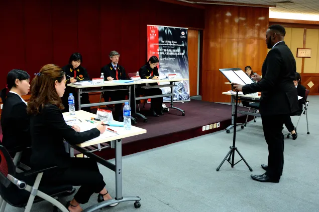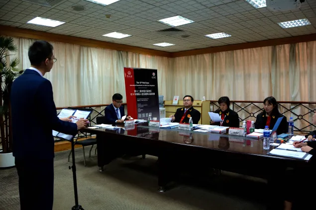 北京大学代表队与中国社会科学院大学代表队争夺冠军。中国社会科学院大学代表队辩手正在进行陈述。决赛法官包括红十字国际委员会东亚地区代表处副主任拉里·梅比先生、中山大学法学院院长黄瑶女士、吉林大学何志鹏教授、香港中文大学何世勋教授、香港中文大学Gordon Gregory教授。