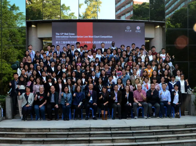 11月23日,第十二届中国大陆地区红十字国际人道法模拟法庭竞赛在中山大学隆重开幕,参赛选手、教练、法官们合影留念。
