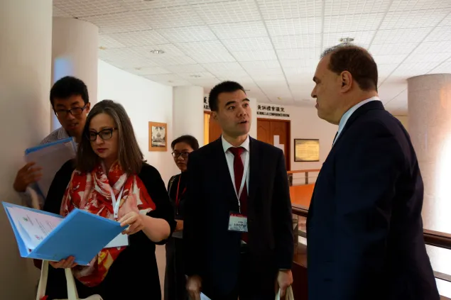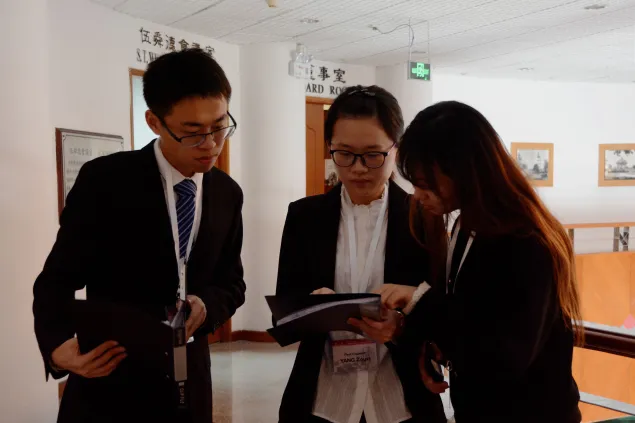 比赛开始前,法官们在热烈讨论案情。从右至左:香港中文大学Gordon Gregory教授,中国社会科学院国际法研究所廖凡教授、浙江工商大学Susannah Linton教授、山东大学田立博士。
