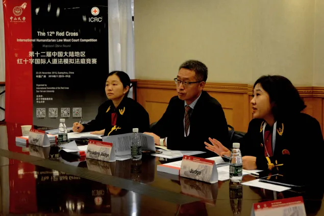 法官正在向选手发问。法官从左至右依次为:广东广东省人民政府外事办公室国际交流处副处长袁律丽(左),中国社会科学院研究生院柳华文教授(中)和联合国难民署驻华代表处官员王奇帆(右)。
