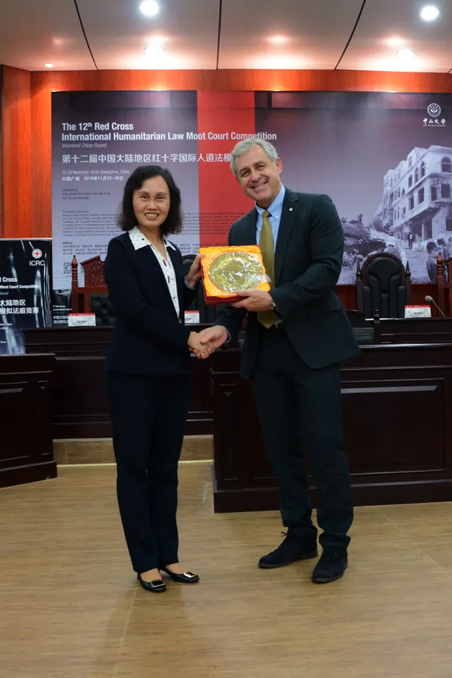 中山大学法学院院长黄瑶女士与红十字国际委员会东亚地区代表处副主任拉里·梅比先生交换礼物。