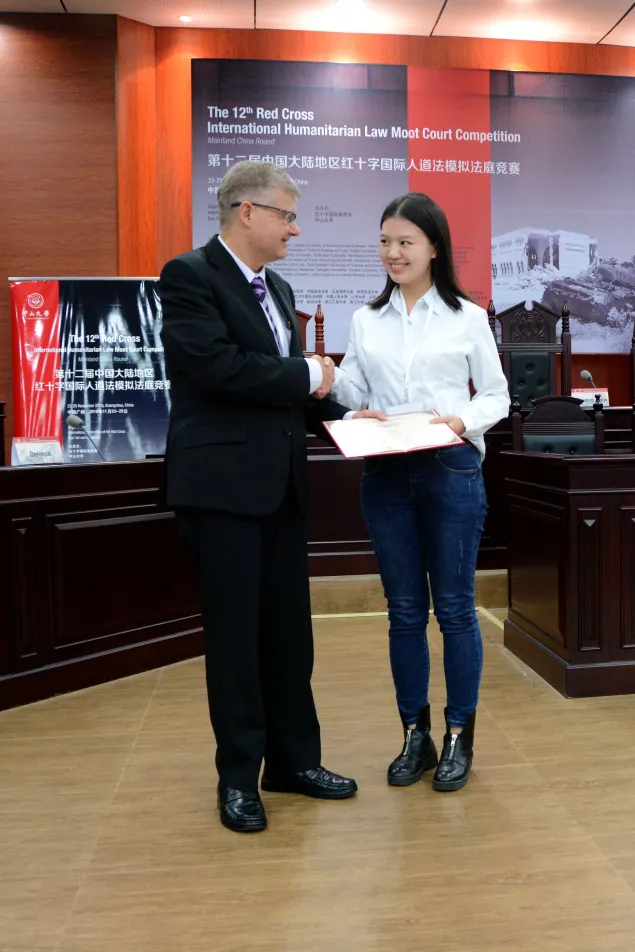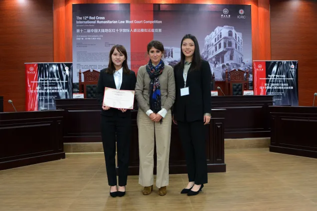 红十字国际委员会东亚地区代表处法律部主管玛格丽塔·阿斯卡尼奥女士为获得第四名的中山大学代表队颁奖。
