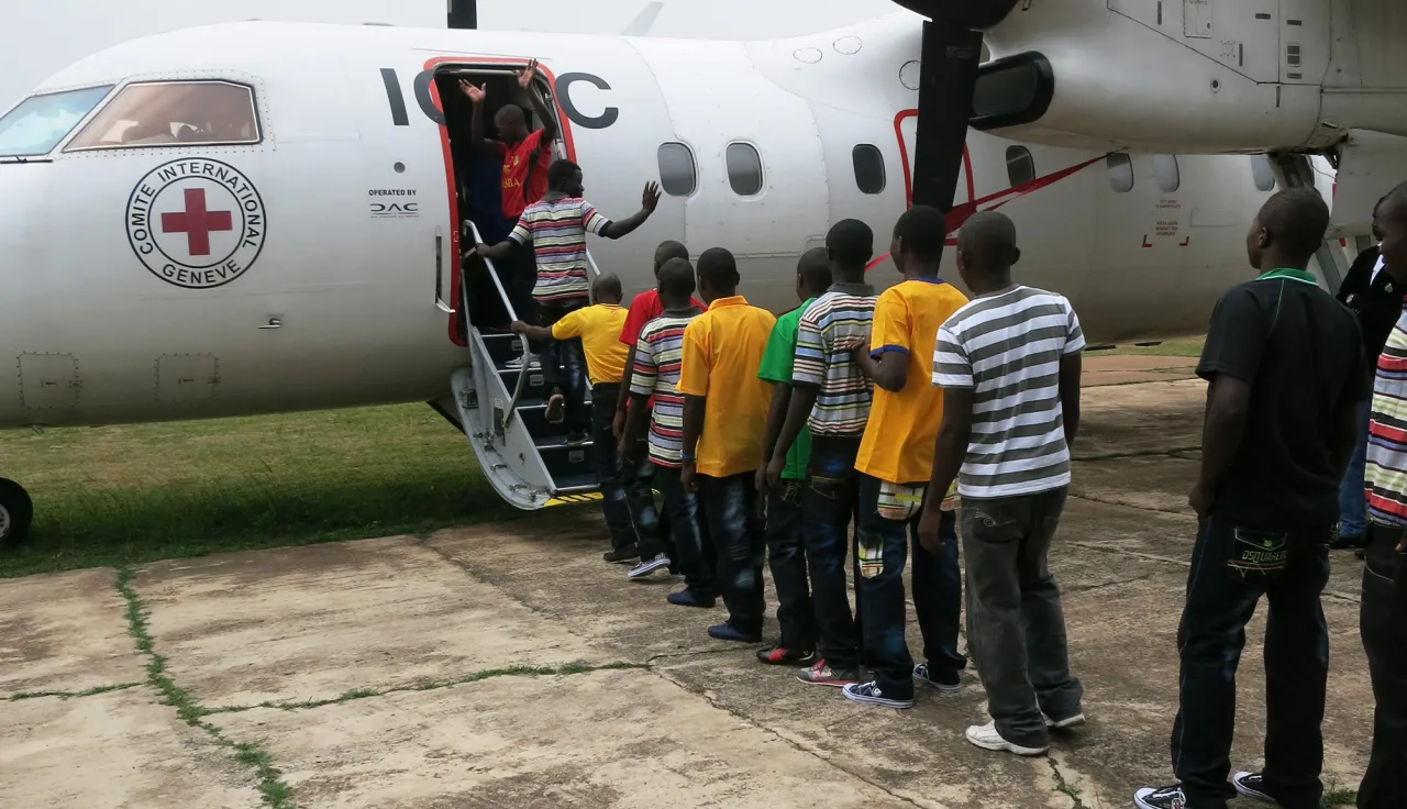 为了寻找儿童的家人,红十字国际委员会员工(有时在国家红会志愿 者的陪同下)乘坐汽车、摩托车、骑自行车或步行,长途跋涉,常常需要前往该国最偏远的地方。2014年7月和8月,作为政府复员项目的一部分,红十字国际 委员会帮助先前与武装部队或其他武装团体有牵连的99名儿童与家人团聚。我们从卡米纳军事基地安排了几次航班,将儿童送回该国东北部他们的家里。