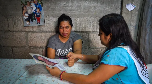 奥尔加·布兰卡·蒙德拉贡(Olga Blanca Mondragón)向红十字国际委员会工作人员介绍她的丈夫莱宁·布拉迪米尔·卡斯塔尼翁·罗德里格斯(Lenin Bladimir Castañón Rodríguez)的情况,他于2019年7月9日星期二在奇尔潘辛戈失踪。在拍摄这张照片几天后,他的遗体被找到并交给了家人。