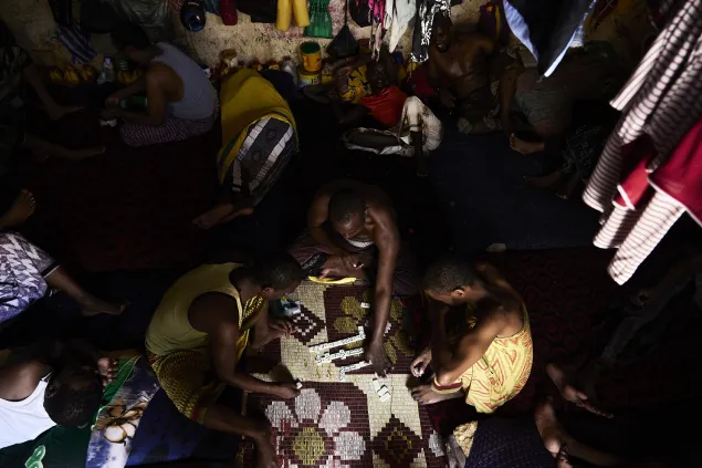 图中,一些被拘留者在玩棋盘游戏。多米诺骨牌和纸牌等游戏是拘留场所里最受欢迎的消遣方式。