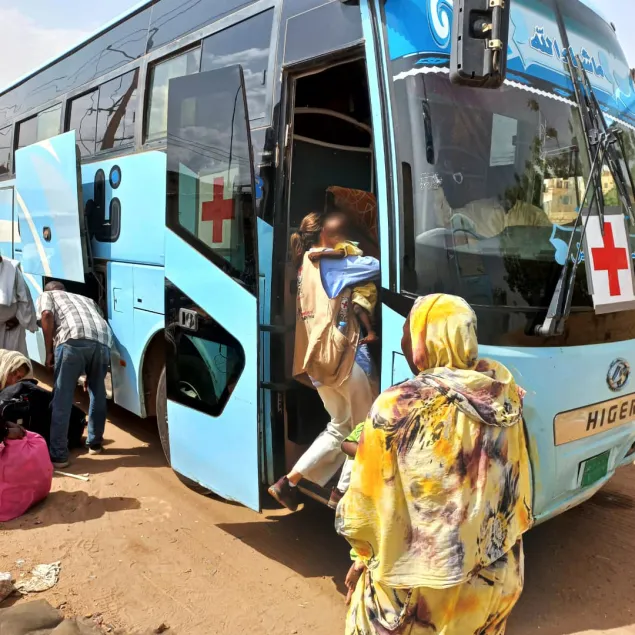 在疏散行动中,红十字国际委员会工作人员抱着一名儿童登上巴士。