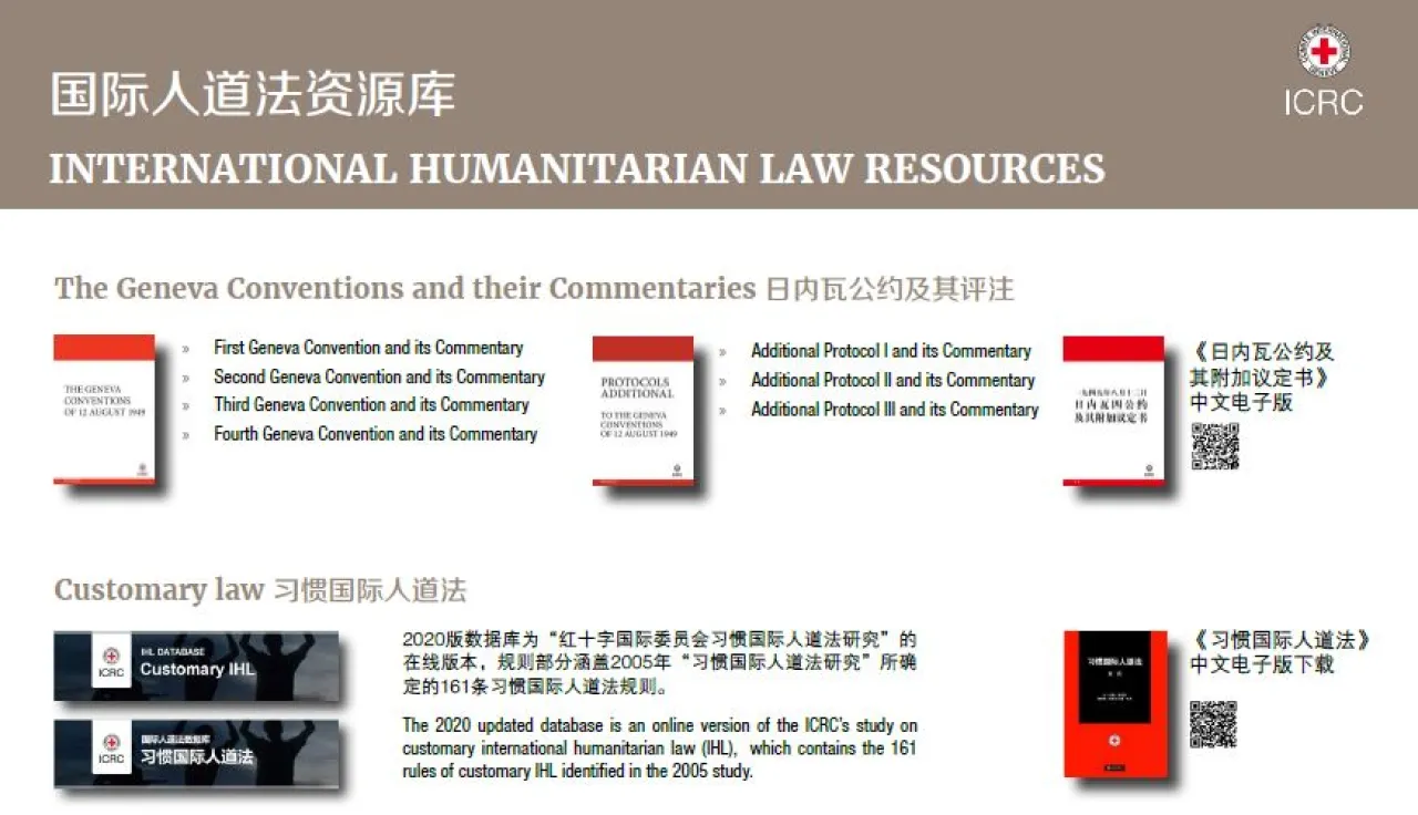 从拥有离线模式的国际人道法APP到《红十字国际评论》等重要出版物,从可轻松检索的习惯国际人道法数据库到百家争鸣的人道法及政策博客,最重要的国际人道法资源一页尽览。点击PDF文件中的链接,丰富资源便可一键直达!扫描文件中的二维码,亦可直接下载或浏览相关资源。