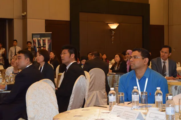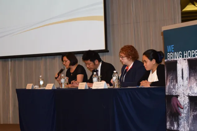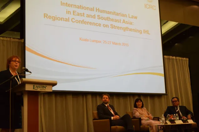 红十字国际委员会吉隆坡地区法律顾问凯利西亚娜•锡恩在开幕式上发言。在座嘉宾(从左至右)有红十字国际委员会吉隆坡地区代表处主任杰里米•英格兰,马来西亚外交部副秘书长何美蓉和亚非法律协商组织副秘书长拉赫马特•穆罕默德教授。